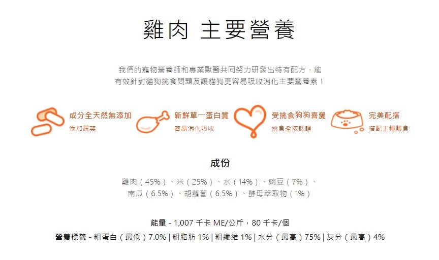 優質成分 : 我?採用鮮味十足?新鮮雞肉,再配搭南瓜、甘筍同青豆等超級食物,滋味滿分又健康。