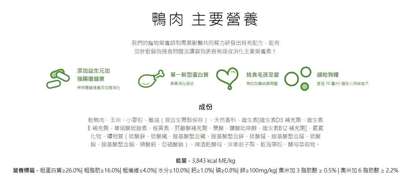- 挑食狗狗的最佳選擇,濃郁的鴨肉風味讓牠們無法抗拒