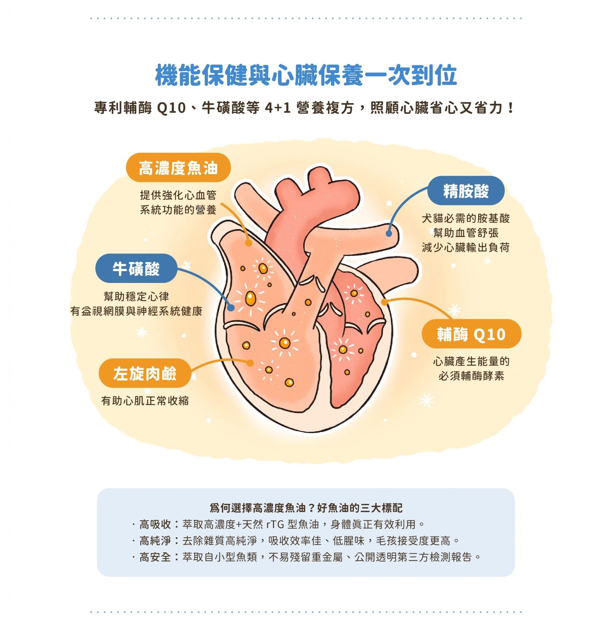 最純魚油+日本 Co-Q10,心臟保養更加分!• 西班牙頂級魚油+日本專利輔? Q10• 全齡毛孩機能保健• 熟齡&部分品種犬貓加強補充