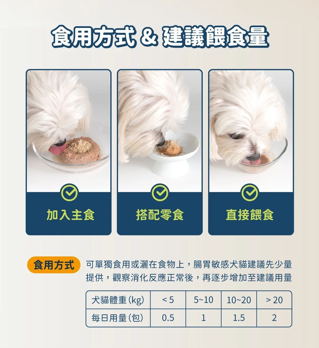 食用方式:可單獨食用或灑在事物上,腸胃敏感犬貓建議先少量提供,觀察消化反應正常後,再逐步增加至建議用量。