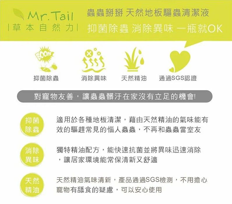 ‧ 適用於各種地板清潔,藉由天然精油的氣味驅趕常見的惱人蟲蟲,不再和蟲蟲當室友