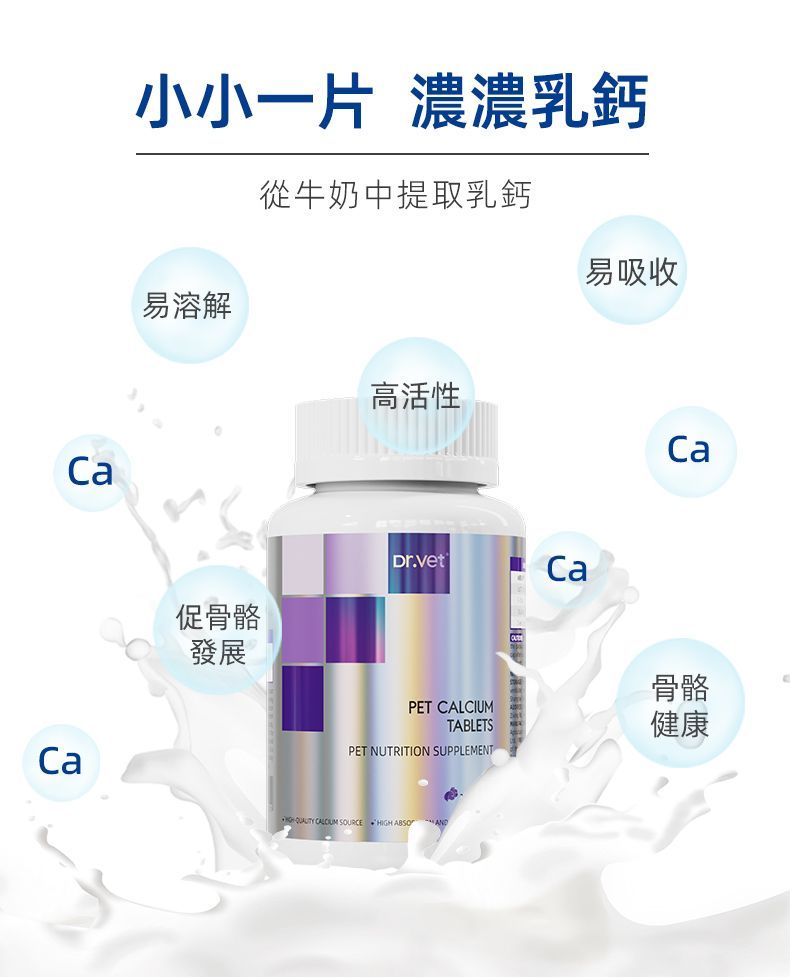本品富含天然乳鈣、酪蛋白磷酸?和維他命D3雙重促鈣因子,可幫助犬貓更好地攝取和吸收鈣,提高鈣的生物利用度,維持機體正常生理功能對鈣的需求,適用於犬貓各生長階段的鈣質補充。