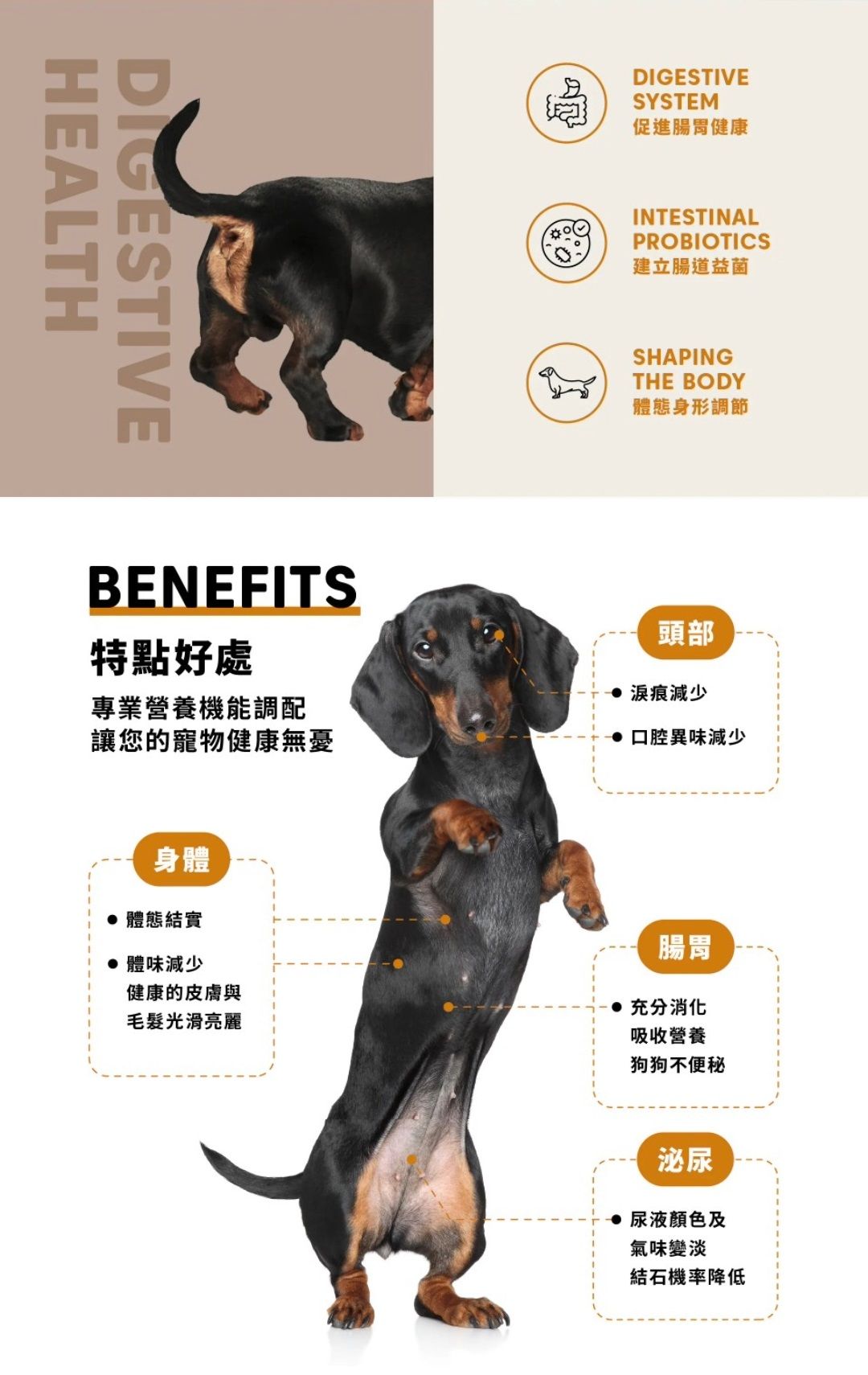 台灣產去皮雞胸肉、新鮮馬鈴薯、新鮮番薯、新鮮南瓜、非基改豆腐、新鮮牛蒡、新鮮海藻、新鮮木瓜、新鮮芹菜、牛奶鈣、亞麻仁籽萃取物(Omega-3)、綜合維生素礦物質