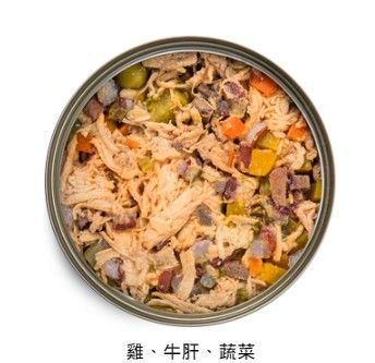 chicken雞肉 (34%),beef liver牛肝 (10%),pumpkin南瓜 (8%),carrot胡蘿蔔 (8%),spinach菠菜 (4%),bean青豆 (4%),brown rice糙米 (4%),water水 (28%)