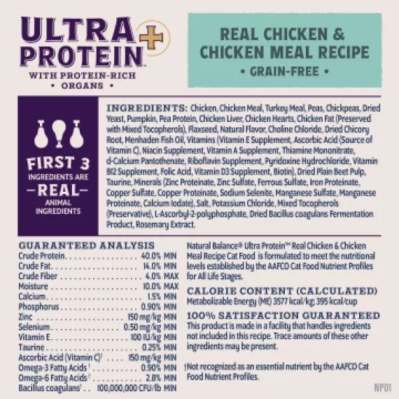 Natural Balance Ultra Protein Plus 免疫和消化健康真雞肉和雞肉粉配方貓糧的配方符合美國飼料管理協會 (AAFCO) 為所有生命階段貓咪所製定的營養標準。