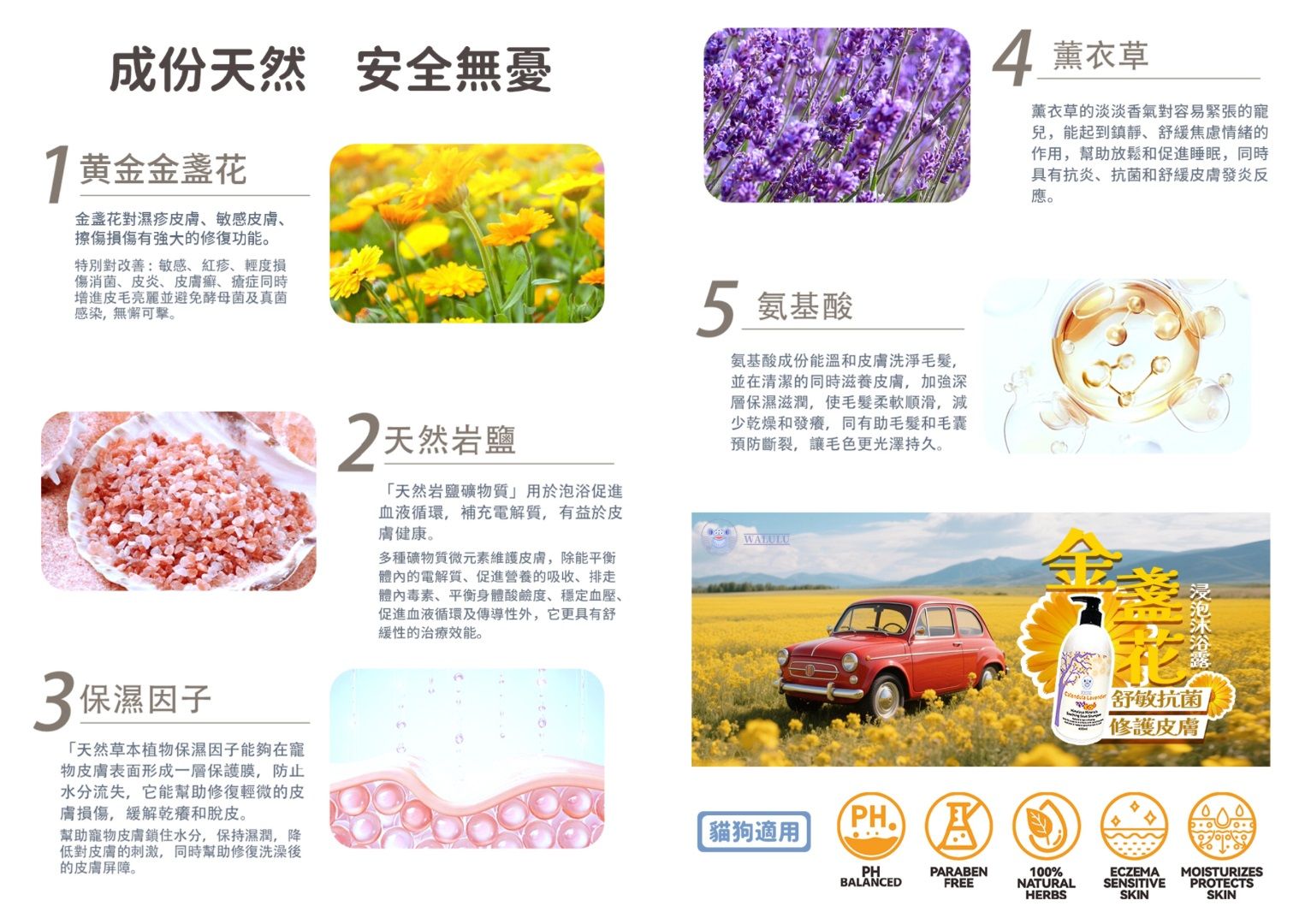100%天然成份金盞花,可效癒合修復傷口,保濕因子深層呵護肌膚