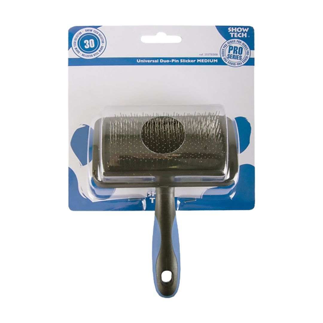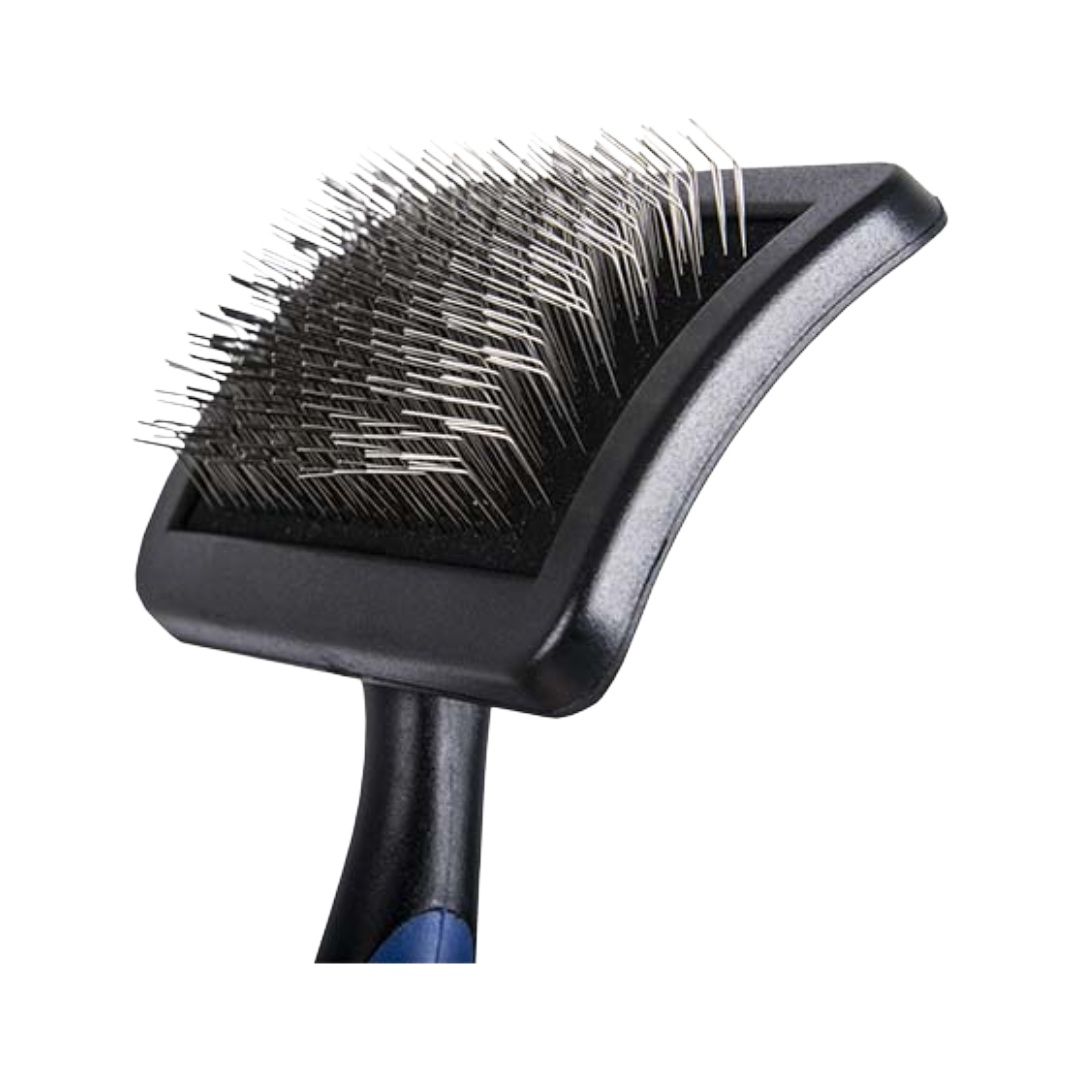 獨特的雙針設??計具有長、短耐用的斜齒。經典的弧形背部設計非常適合去除最頑固的墊子和纏結,即使在難以觸及的地方也是如此。通用雙針刷非常適合在沐浴後吹乾毛髮時使用。順著毛髮生長的方向或逆著毛髮生長的方向,輕輕地、長時間地撫摸。慢慢刷以避免靜電累積。為了防止毛髮打結和纏結,應定期給狗狗洗澡、使用護髮素護理並每天梳理毛髮。