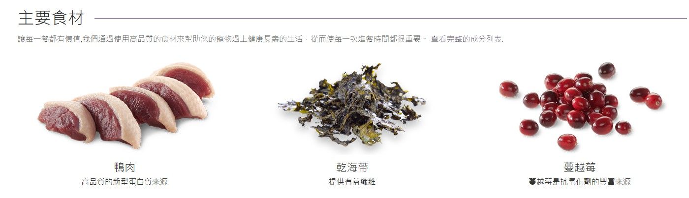 去骨新鮮火雞肉、火雞粉、豌豆、馬鈴薯蛋白、馬鈴薯、菜籽油(混合生育酚用以保存)、番茄渣、鴨肉、豬肉粉、亞麻籽、天然火雞香料、小紅莓、菊苣根萃取物、綜合維它命[維它命E、菸鹼酸、β-胡蘿蔔素、維它命A、硫胺素、鹽酸?哆醇、D-泛酸鈣、核黃素、維它命D3、維它命B12、葉酸、生物素、抗壞血酸(維它命C)]、礦物質[鋅蛋白鹽、硫酸鋅、鐵蛋白、硫酸亞鐵、硫酸銅、銅蛋白鹽、錳蛋白、硫酸錳、亞硒酸鈉、碘酸鈣]、氯化膽鹼、加入混合生育酚以保存新鮮、牛磺酸、乾海帶、絲蘭萃取物、乾胚芽乳酸桿菌發酵物、乾屎腸球菌發酵物、乾凱氏乳桿菌發酵物、乾嗜酸乳桿菌發酵物、迷迭香萃取物、綠茶萃取物。